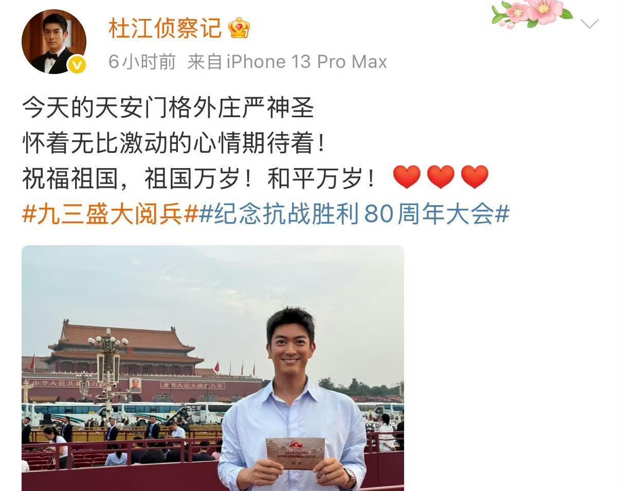 杜江发文:今天的天安门格外尊荣圣洁怀着无比承诺的边幅期待着!道喜故国,故国万岁!和平万岁!