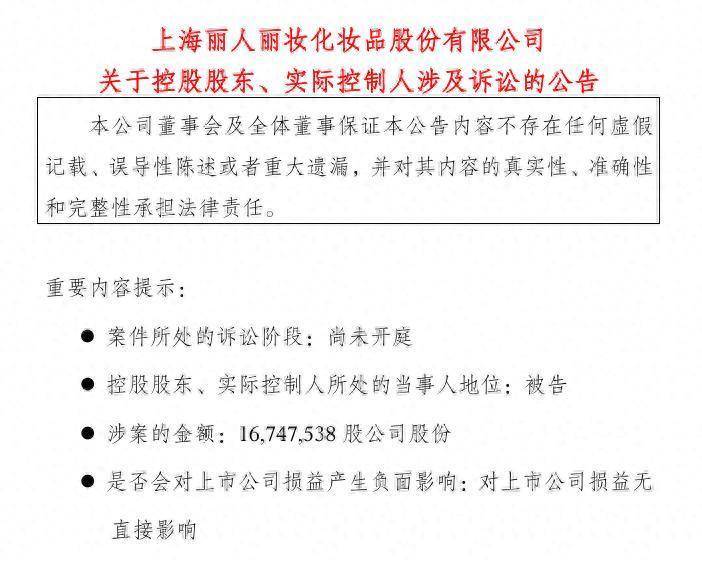 9月29日盘后,丽东说念主丽妆(沪市代码:605136)公告称,近日,公司收到控股鼓吹、本体范围东说念主黄韬先生告知,得知其收到了上海市徐汇区东说念主民法院举证告知书及应诉告知书((2025)沪0104民初26465号),因黄韬先生触及仳离后财产纠纷,前妻翁淑华女士肯求将登记在黄韬先生名下的公司股份中的1674.75万股过户至子女黄逸琪名下。