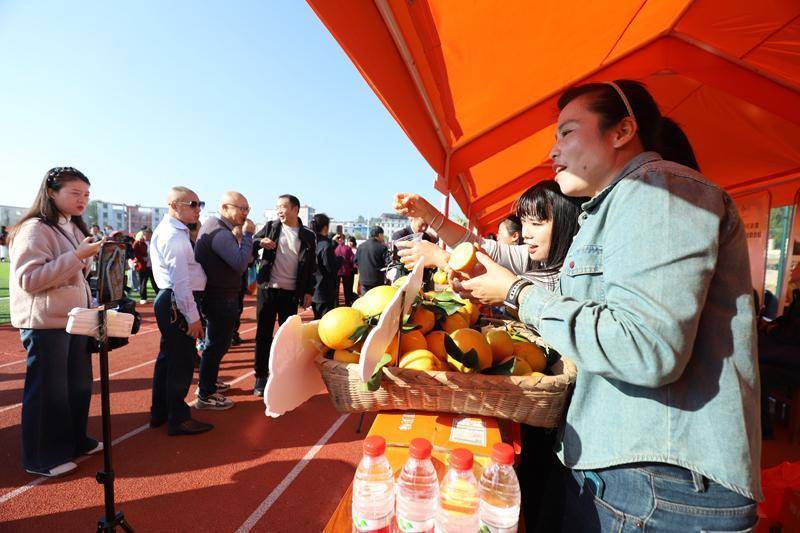 “家东谈主们看,这是咱们池江的脐橙,果形弥散、光泽金黄,一口下去汁水充沛、清甜爽口!”现场脐橙展销区,黄蔼岭家庭农场领路东谈主刘淑萍正景仰地进行直播。金黄的脐橙堆叠如山,诱惑不少网友线崎岖单。